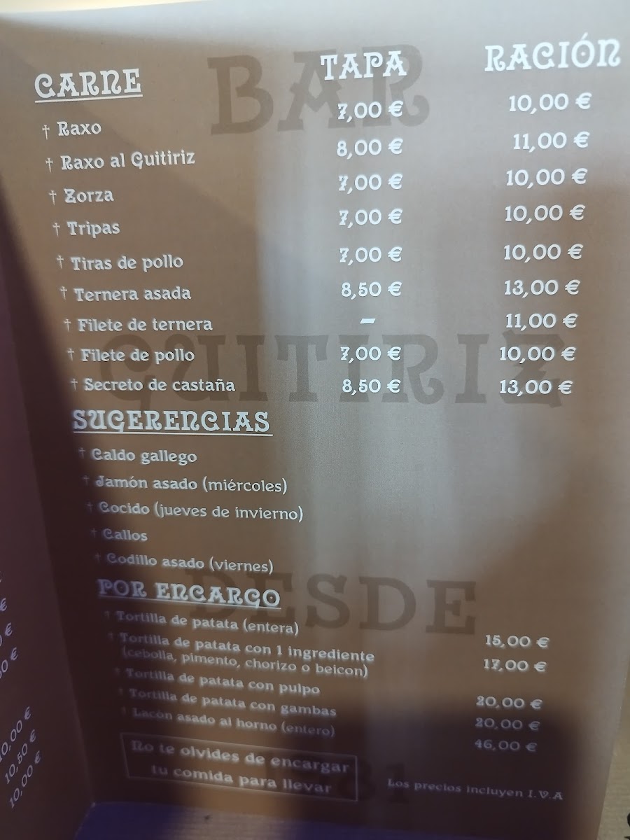 O GUITIRIZ is a charming tapas restaurant nestled in the heart of A Coruña. Its menu, though modest with two starters and two main dishes, excels in quality and generous portions. Dishes like callos, pulpo, and codillo stand out for their rich, homemade flavors that evoke comfort and authenticity.